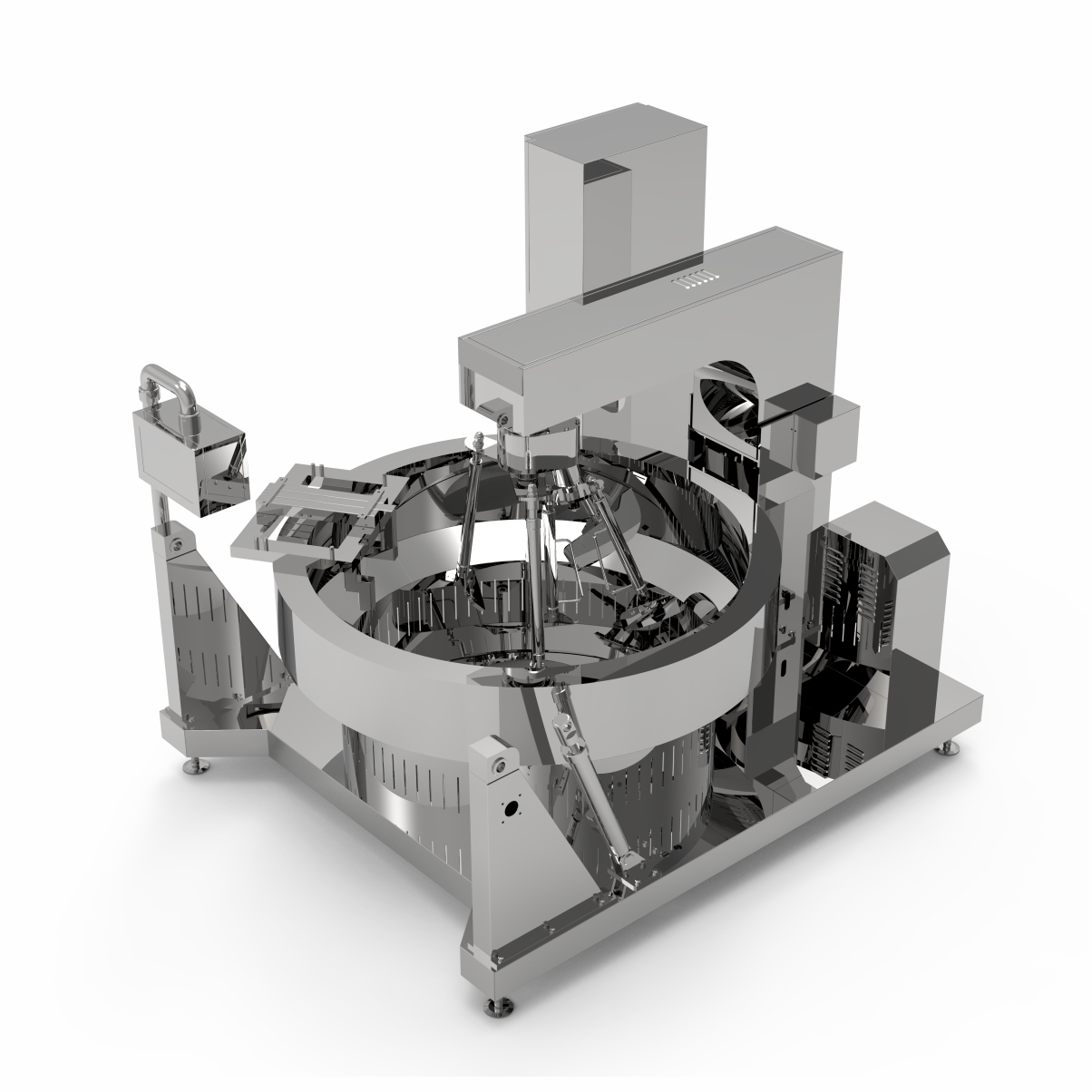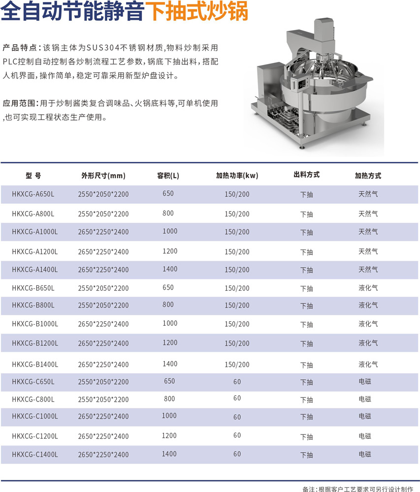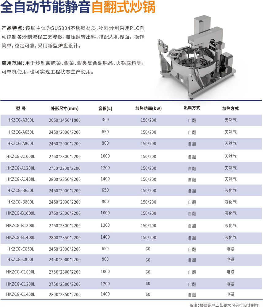 該鍋主體為SUS304不銹鋼材質(zhì),物料炒制采?PLC?動控制各炒制流程?藝參數(shù),液壓翻轉(zhuǎn)出料,搭配?機界?, 操作簡單,穩(wěn)定可靠,采?新型爐盤設(shè)計。