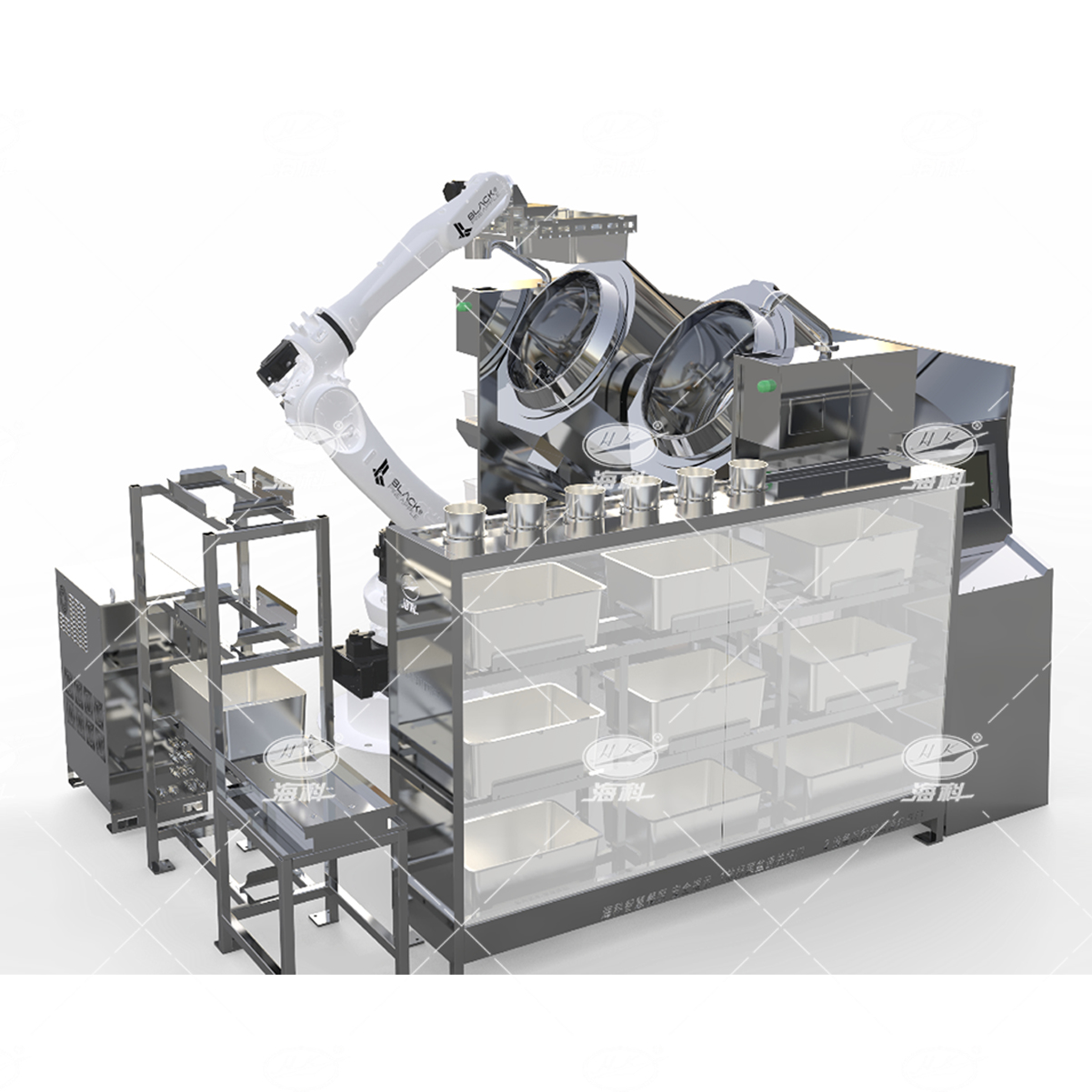 可用于集體用餐的食堂(機關、院校、工廠、中央廚房配餐中心等大型食堂)等場景量身打造的烹飪系統(tǒng),主要由空盆/成品智能庫、凈菜/調理肉/調料智能庫、工控上位機SaaS軟件系統(tǒng)、數字化智能炒菜鍋以及工業(yè)級機器人組成,工控上位機對接云端,接收并統(tǒng)一向各模塊發(fā)出指令。