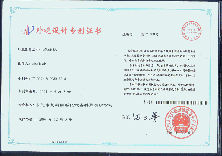 我司于2004年獲得繞線機(jī)技外觀設(shè)計(jì)專利證書: